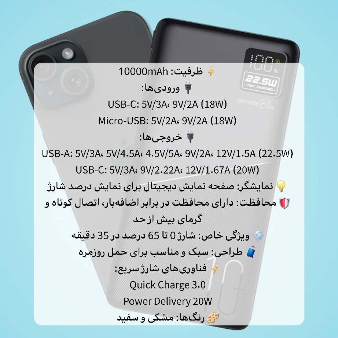 نقد و بررسی پاوربانک 22.5 وات پرودو مدل Porodo PB053 ظرفیت 10000 میلی آمپر ساعت فقط خریداران این محصول می توانند نقد و بررسی ثبت کنند