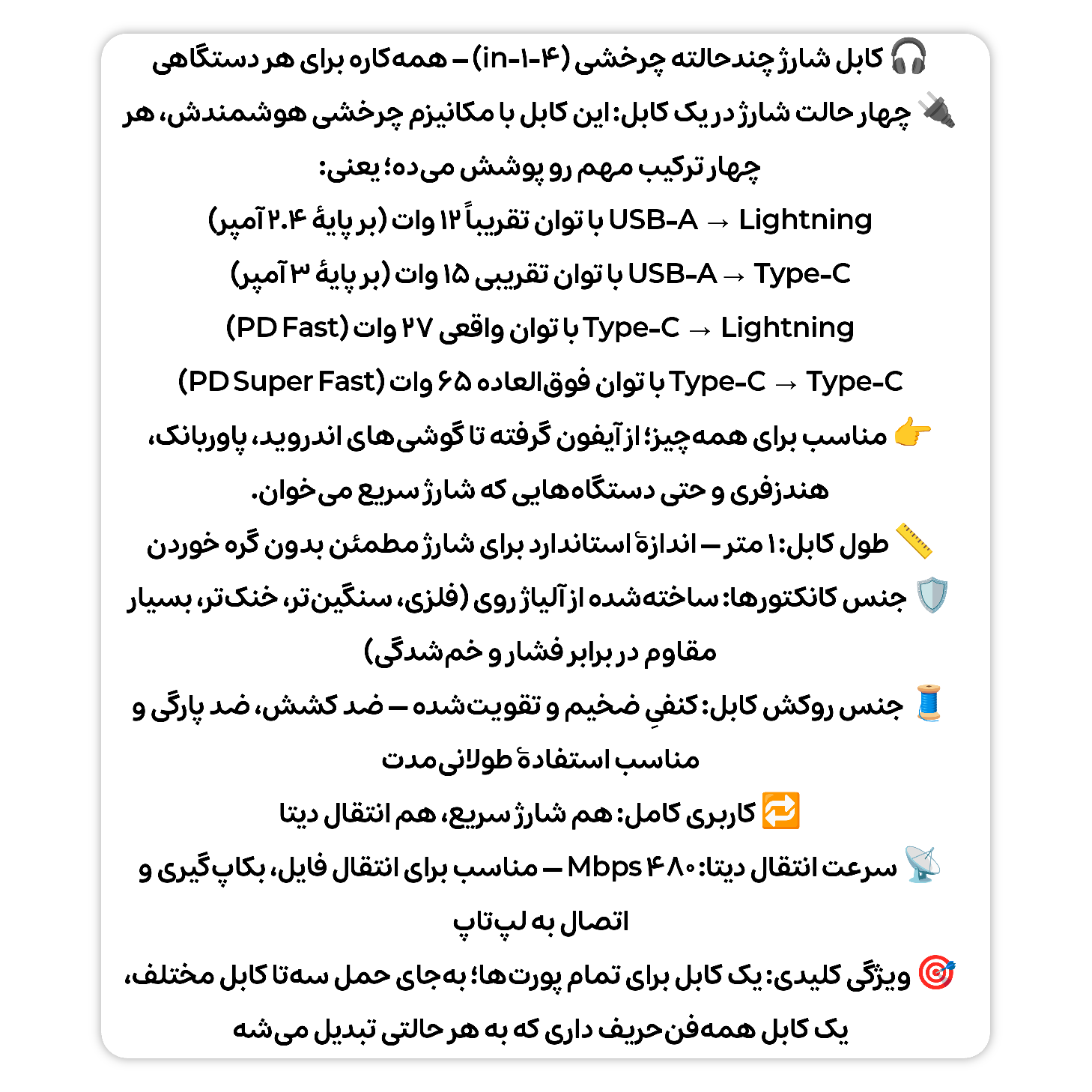نقد و بررسی کابل شارژ 4 در 1 کانفلون مدل Konfulon Zinc Alloy Cable DC73 فقط خریداران این محصول می توانند نقد و بررسی ثبت کنند